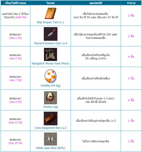 1. ในช่วงเวลากิจกรรม เมื่อโจรสลัดทำการออนไลน์ในเกมครบ 2 ชั่วโมง จะมีสิทธิ์รับ"ไอเทมรางวัล" ได้ 1 ครั้ง/ 1 วัน